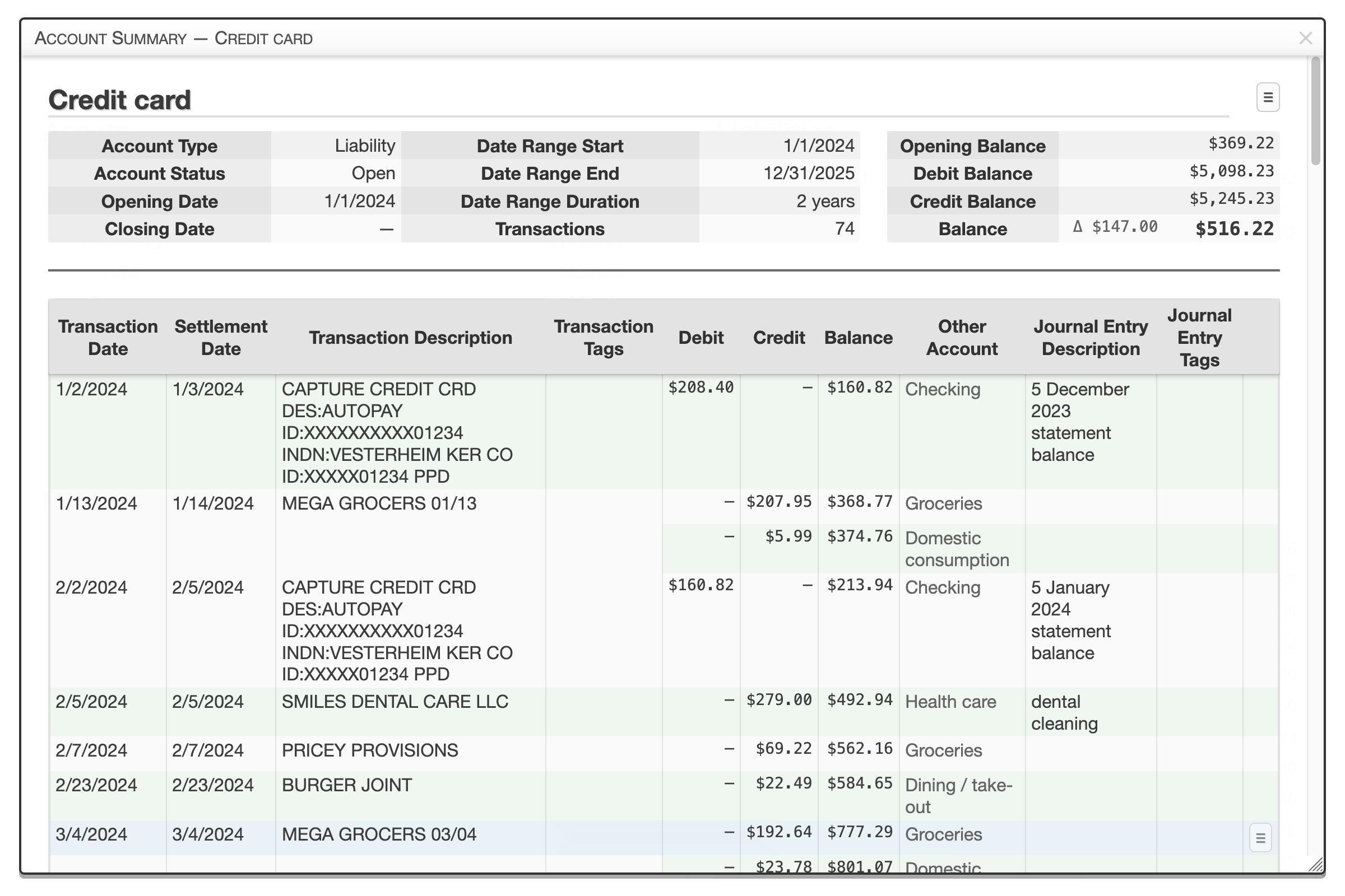 The Account Summary view shows a summary of a single account and a chronological list of its journal entries.