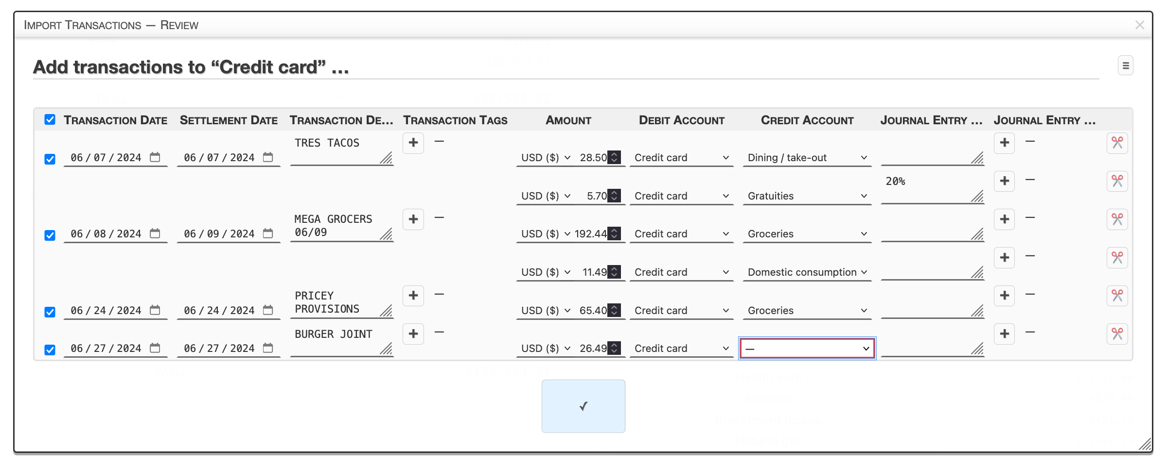 The Import Transactions — Review view allows transaction data to be reviewed and modified before being imported.