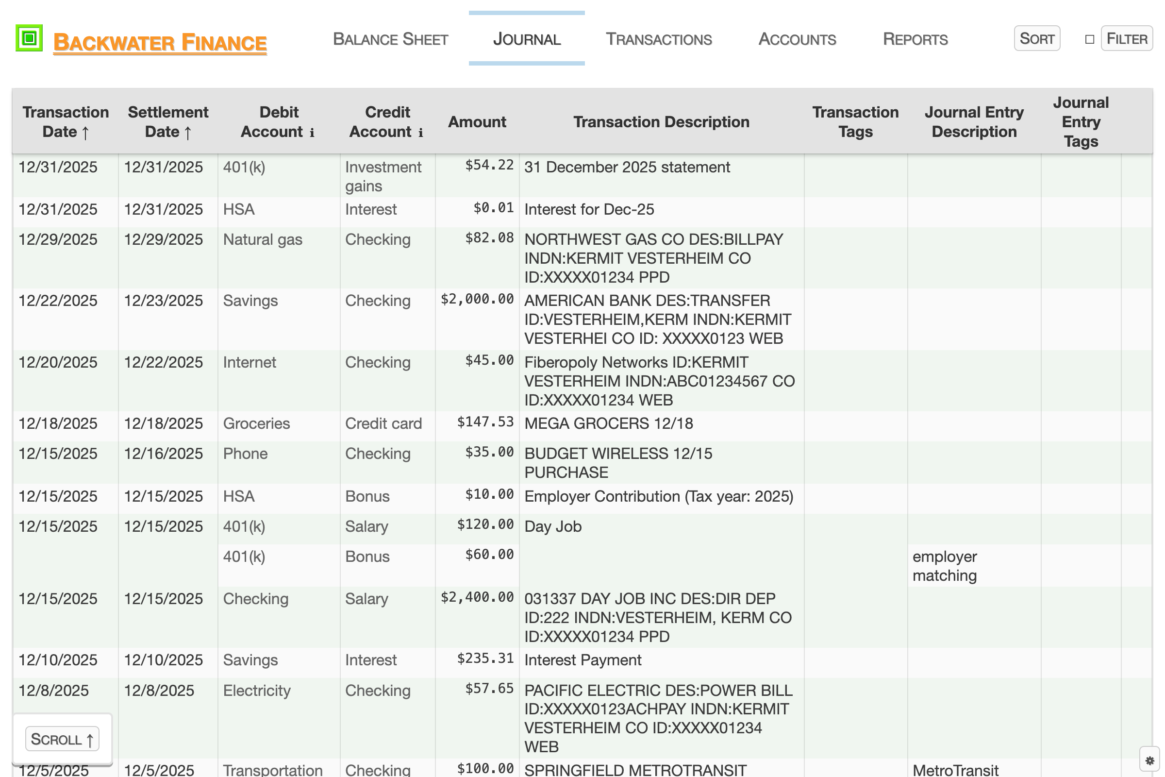The Journal view shows a filterable, sortable, chronological list of transactions / journal entries.